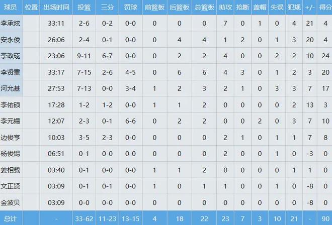 韩国男篮两人得分20+,李政玹24分2板4助,李贤重20分6板4助3断,全队三分球23中11,命中率高达约48%。